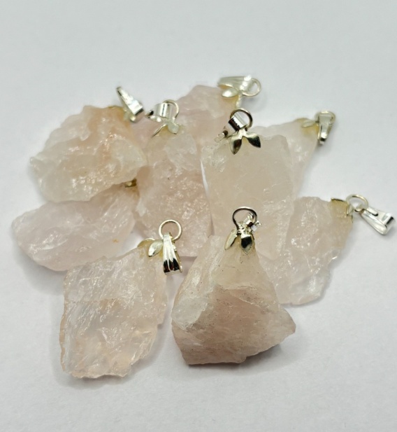 Wisiorek z nieoszlifowanym naturalnym kwarcem różowym w formie bryłki oraz zaczepem ze stali chirurgicznej w kolorze srebrnym.